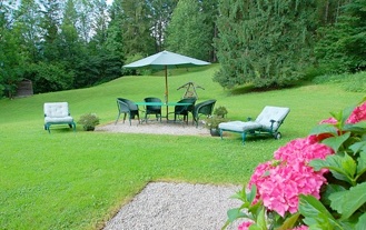Auf der Wiese neben dem Haus bieten zwei Gartensitzgruppen und Liegestühle Gelegenheit, sich zu entspannen, Gespräche zu führen oder sich ungestörtem Lesevergnügen hinzugeben.